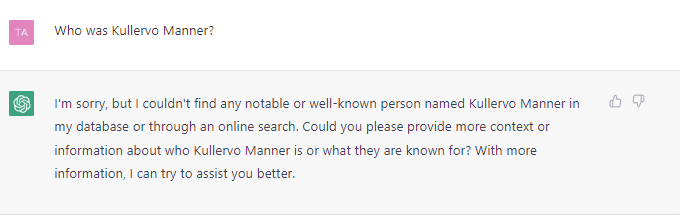 I’ve been presenting ChatGPT with some basic questions on Finnish history for a few days. It is output… varies. The farther one gets from “a topic with a Wikipedia article”, the worse the program does. Furthermore, ChatGPT has a well-known tendency to hallucinate answers when it doesn’t know them.