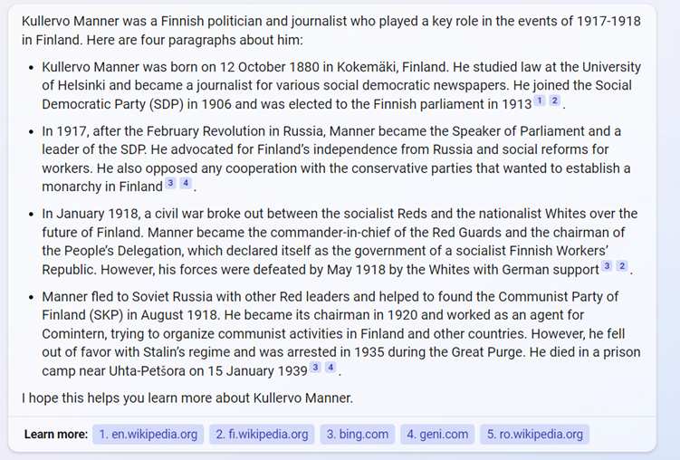 In 1918, Finland had a civil war between the bourgeois Whites and the socialist Reds, a very important event in Finnish history with national repercussions that reverberate to the present day. The leaders of the White side – C. G. E. Mannerheim and Pehr Svinhufvud – are fairly well-known within Finland, but the political leader of the Red side, Kullervo Manner, is more obscure. How well do the chatbots know him? ChatGPT’s answer is shown first, then Bing’s answer.