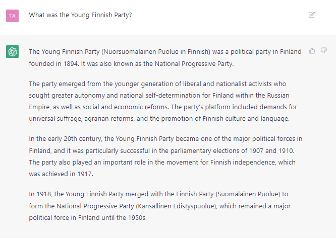 ChatGPT does a bit better with the Young Finnish Party, but also commits some obvious errors. The Young Finnish Party was not known as the National Progressive Party; National Progressive Party, as the algorithm states later, was formed only after 1918.