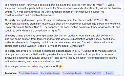 The Young Finnish Party, though it is no longer among us, was arguably the most important Finnish liberal force to exist in Finland’s history, with a key role to play in Russian-era politics and the formation of Finnish national consciousness. How will the chatbots describe this party?