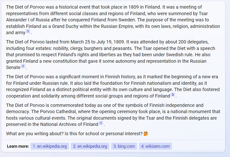 The two obvious error I could find in Bing’s telling was that the Diet of Porvoo had 134 members, not 200, and Finland wasn’t guaranteed representation in the Russian Senate, having her own Senate instead. It might be a topic of discussion whether, for instance, whether the Diet is a symbol of “Finnish democracy” (it was a thoroughly undemocratic feudal-style meeting presided over by an absolutist autocrat, after all.)
