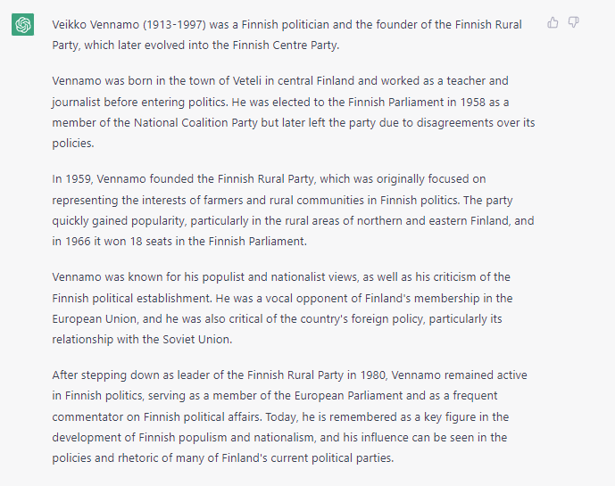 Let’s start by counting the copious errors made by ChatGPT. Vennamo did not split from the National Coalition Party, which he never belonged to. As Bing states, he originated from Agrarian League, which later became the Centre Party (instead of Rural Party becoming this party). Vennamo was not born in Veteli and never worked as a teacher. Vennamo stepped down as the leader of the Rural Party in 1979, not 1980. Vennamo never served as a member of the European Parliament. Really, much of what ChatGPT says about Vennamo is outright hallucination.