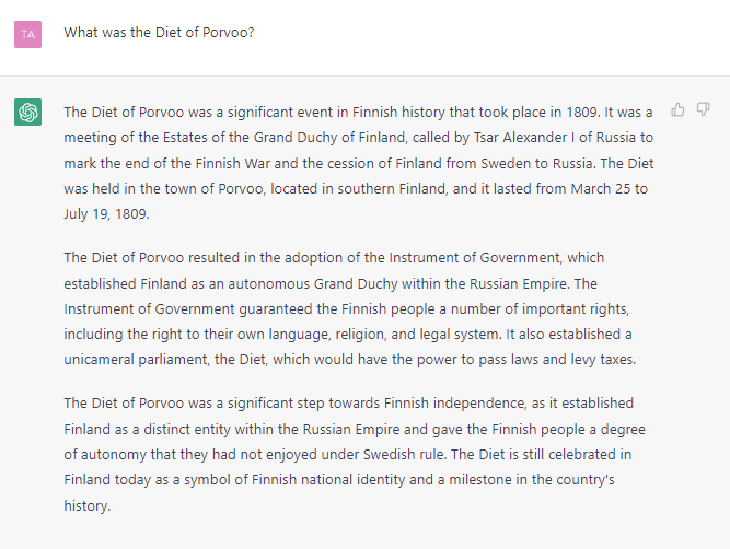 The Diet of Porvoo was arguably when “Finland became Finland”; the Russian Czar Alexander I, who had just conquered Sweden’s eastern provinces, convened this diet to create the Grand Duchy of Finland, an autonomous part of the Russian Empire (well, arguably, it’s still a historical debate what the exact status was), with this later setting the stage for the rise of the Finnish language, the Finnish national movement, eventual Finnish independence and so on. Surely this, if any subject about the Finnish history, should be something the chatbots can teach me more about.