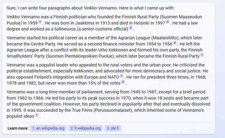 Nevertheless, it is evident that at least in case of Veikko Vennamo ChatGPT would resort to outright inventions about several different facets of his life. Bing doesn’t do this, at least, probably thanks to its improved engine and web search capabilities, but would get several minor details wrong in each of these cases. In any case, it might actually be more dangerous for search engines like these to offer generally reliable information and subtly be wrong about seemingly minor details, since such errors might well end up being more crucial than it might seem.